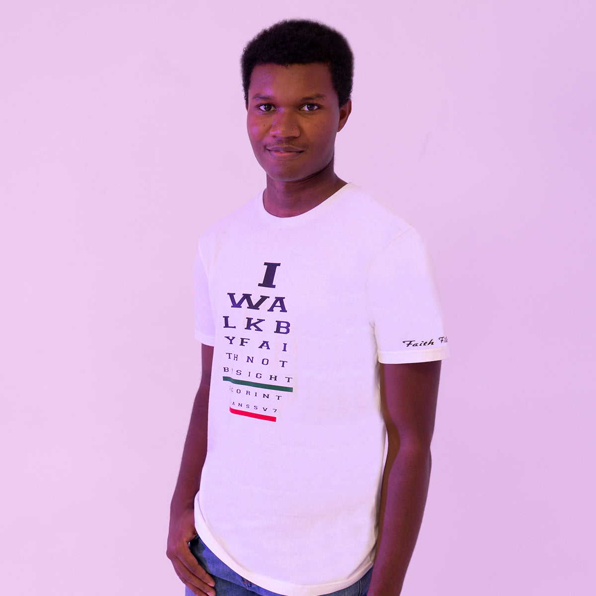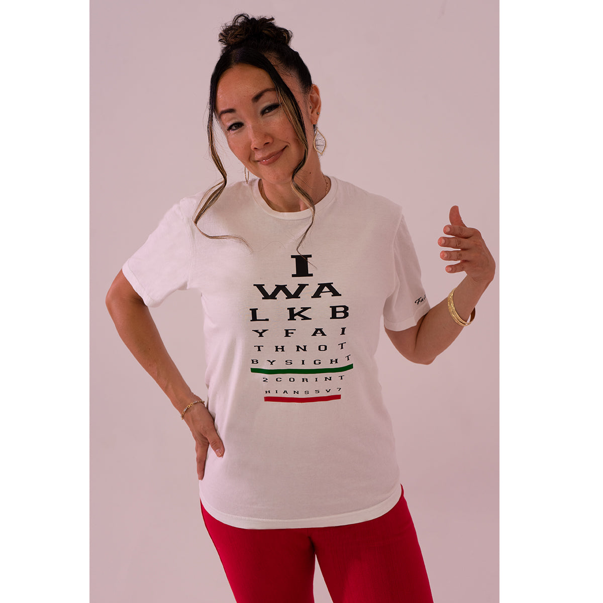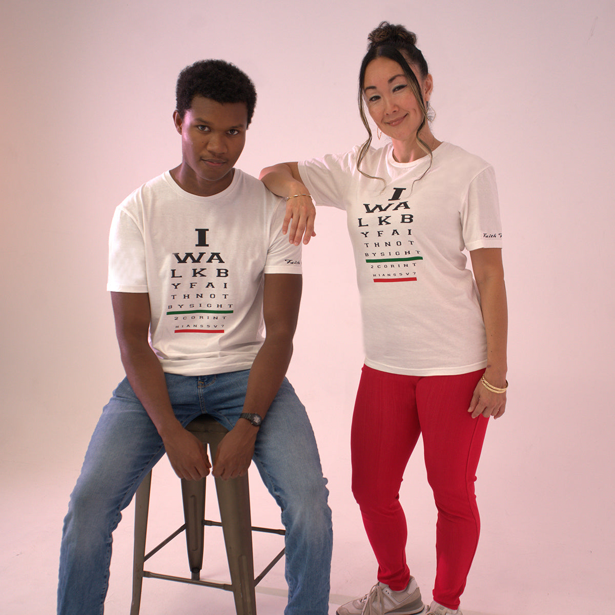 "Step into faith with our inspiring Eye Chart shirt! Designed to remind you to 'walk by faith, not by sight,' this unique tee merges faith and vision in a truly eye-opening way. Available in sizes to fit every believer, this shirt is more than just apparel – it's a statement of courage and belief. Wear your faith, and inspire others to see beyond the obvious!"